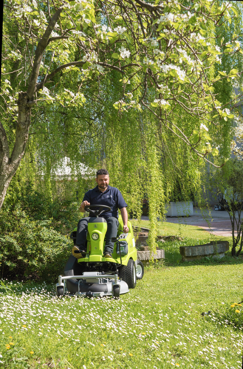 Il piatto flottante permette di avere un taglio perfetto anche in terreni ondulati. L'asse posteriore basculante, le ruote motrici a profilo antiscivolo, insieme alla regolazione della pressione al suolo del piatto, consentono di seguire con precisione dossi e avvallamenti, tagliando in modo preciso e senza rovinare il manto erboso.