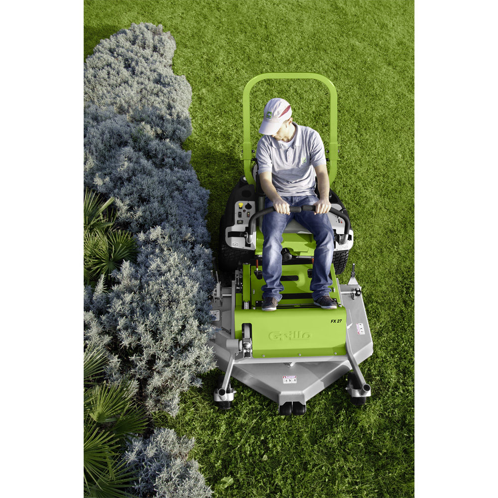 Inoltre, i comandi elettrici per la regolazione dell'apparato di taglio e l'azionamento di innesto lame, il freno-lama di sicurezza che entra in funzione automaticamente, la leva "Quick Shift" per passare in un attimo da taglio Mulching a taglio con scarico posteriore, il freno di parcheggio che si aziona all'apertura delle leve di guida e tutti i comandi a portata di mano rimanendo comodamente seduti, rendono la guida di FX27 piacevole e sicura.