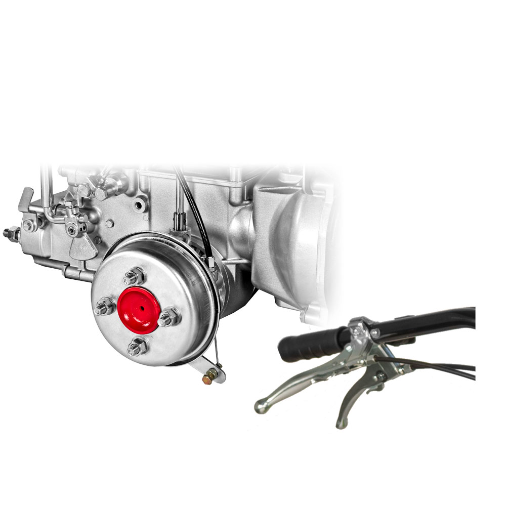 Gli attrezzi sono montati tramite il robusto attacco flangiato. È inoltre possibile arare utilizzare il Kit dedicato composto da ruote maggiorate, allargamenti registrabili a vite, aratro voltaorecchio 180° e zavorre. Per facilitare gli spostamenti a motore spento è possibile disinnestare l’asse ruote.