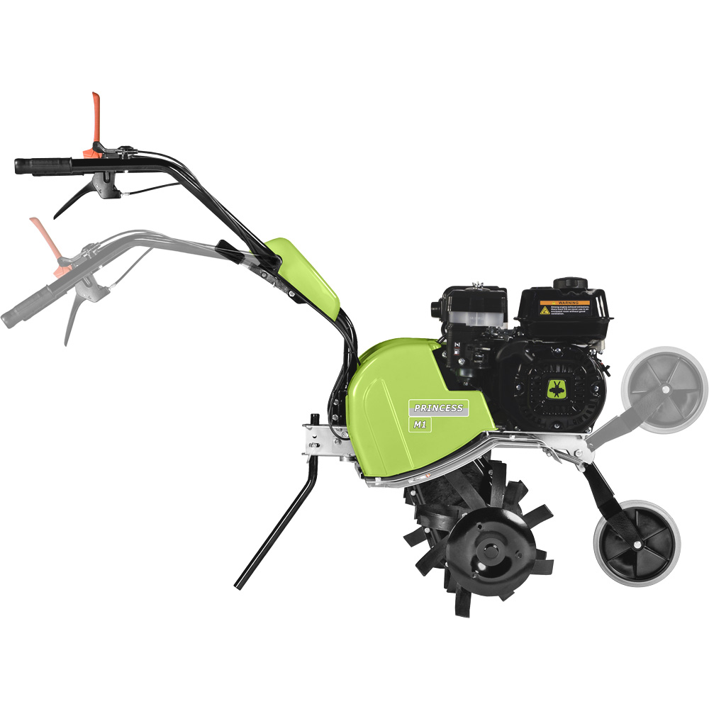 | Grillo Princess M1 è dotata di comando attivo; la leva dell'avanzamento presente sul manubrio, quando premuta, avvia la rotazione delle zappe. Rilasciando la leva, le zappe si fermano immediatamente ed il motore rimane in moto. Massima praticità e sicurezza. |